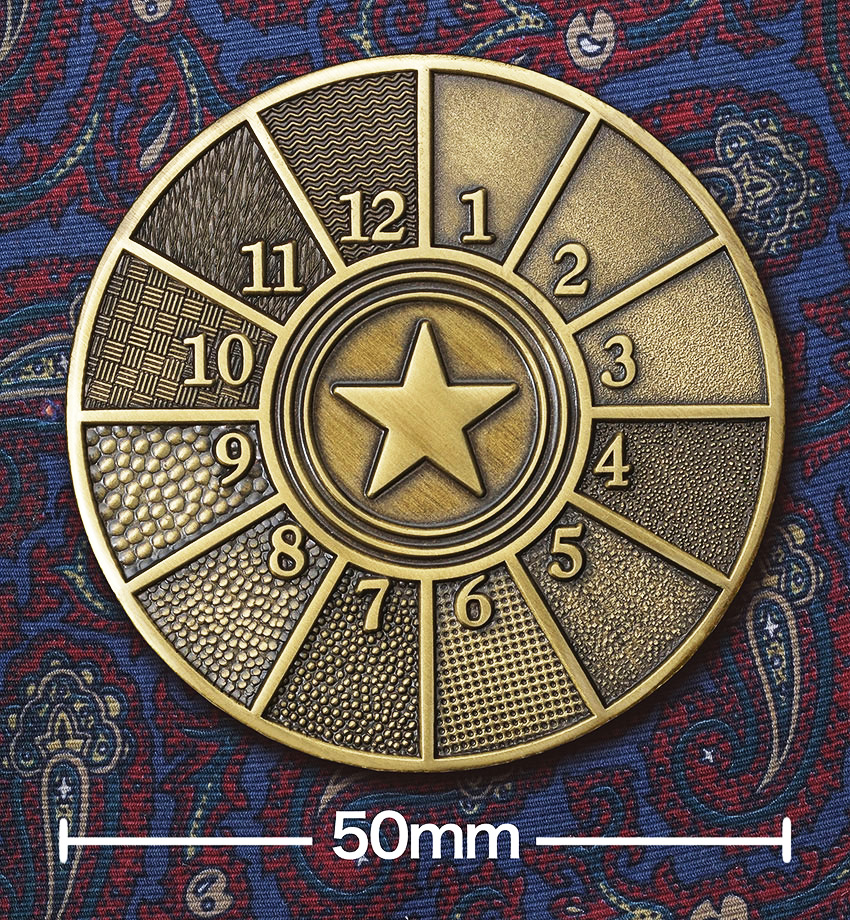バッジは金属の薄板に圧力をかけて凹凸を作り、その凸部にメッキ加工、凹部に色を入れて仕上げることが一般的ですが、凹部に色を入れずに仕上げる方法もあります(スタンプ&サンドブラスティングを参照下さい)。その際凹部には右図に紹介する、さまざまなテクスチャーを施すことができます。ご希望されるテクスチャーがあれば、ご注文時に右図に示す番号をお知らせ下さい。なおテクスチャーはバッジの裏面や凸部にも施すことができます。デザインのイメージに合わせて自由にテクスチャを組み合わせ、唯一無二のバッジ作りをお楽しみ下さい。