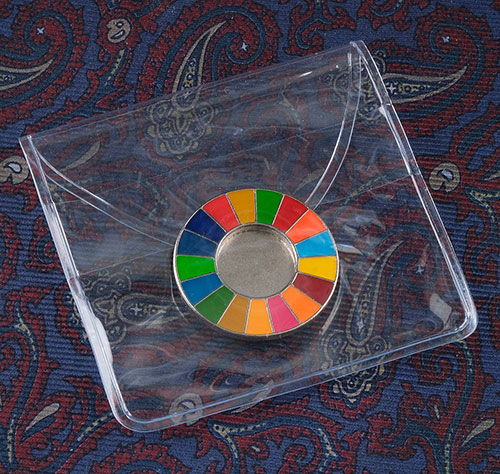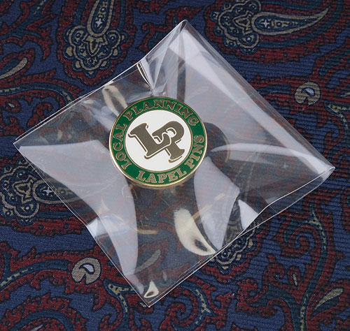 通常、特にご指定がなければポリプロピレン(opp)製の袋に封入して納品いたします。opp袋は透明度が高くシワになりにくいので、納品後はこのまま手渡しすることができます。なおピンバッジの封入方法は、ホッチキス止めではなく、すっきりとした粘着シール式となります。