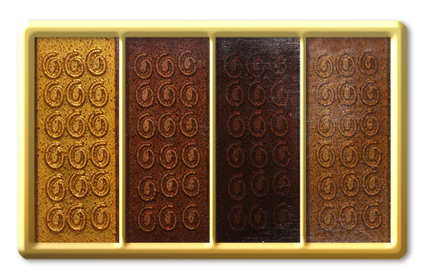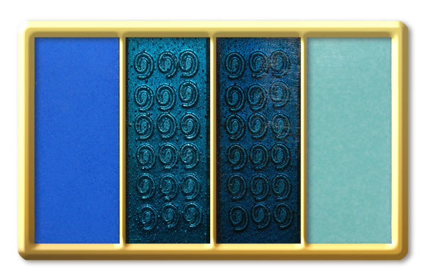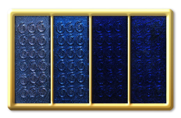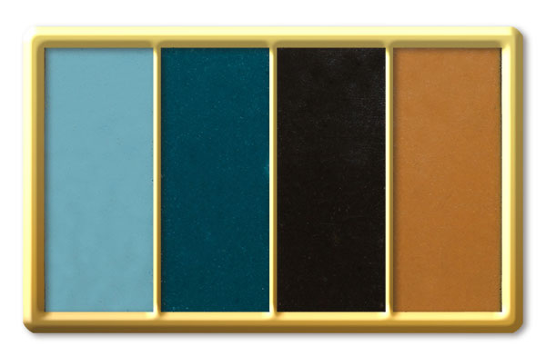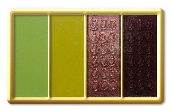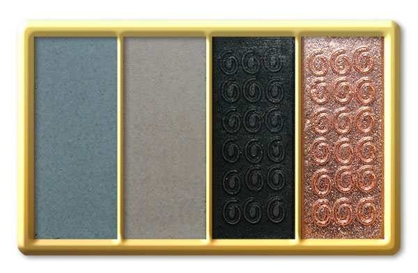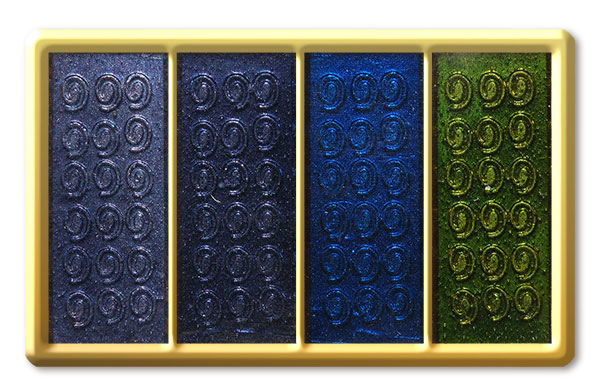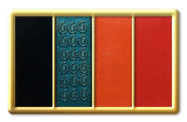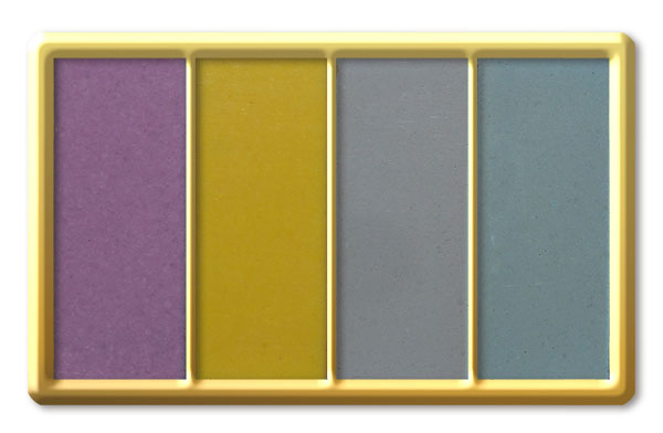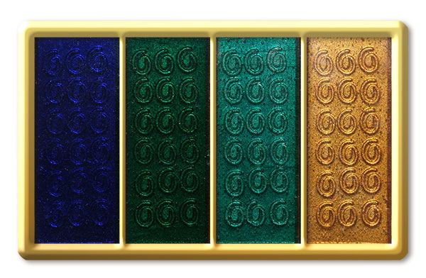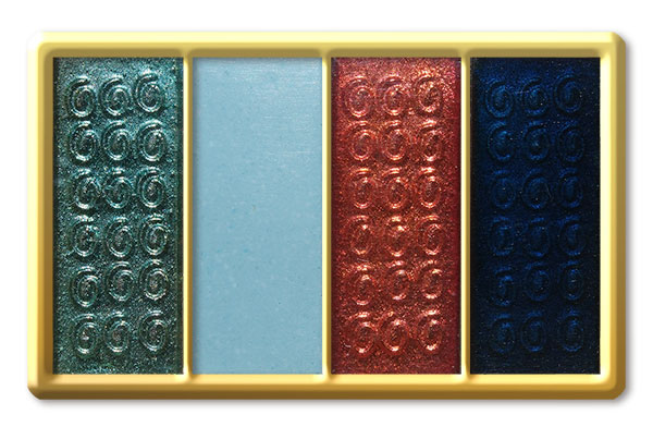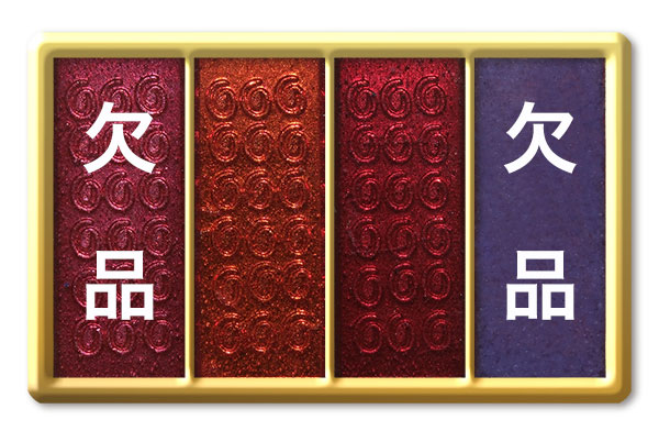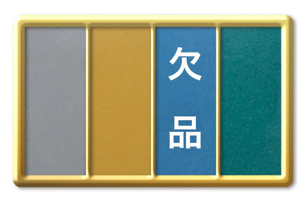 線画が完成したら色を入れます。色調の決定はPantone solid coatedというカラーチャートにておこないます。カラーチャートの色数は2100色以上ありますので、ほぼイメージどおりの色調を選ぶことができるでしょう。色調の決定はPantoneの色番号で指定されることをお勧めしますが、通常は弊社にて色番号の照合をおこなっています。なおバッジの色数は、1色〜4色までが同一料金となり、それ以上は1色増える毎に単価が少し上がります。また、特殊なカラーバリエーションとして、ラメ入り・蛍光色・半透明色などもご用意しています。お気軽にご用命下さい。