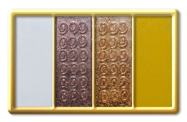 バッジに色を入れないで仕上げる方法もあります。これは、弊社でスタンプ&サンドブラスティングと呼ぶ製造法で、色を入れない社章などで採用されています。作例のメッキはゴールドメッキで、凸となる線の部分は、光沢のあるゴールドメッキ、凹んでいる部分は凹凸感を強調するためにサンドブラスティング(光沢を抑えた砂面)加工を施しています。なお金属の光沢を抑えたい場合は、アンティークゴールド・アンティークシルバー・アンティークブロンズなどのメッキ処理で、バッジをアンティーク調に仕上げることも可能です。
